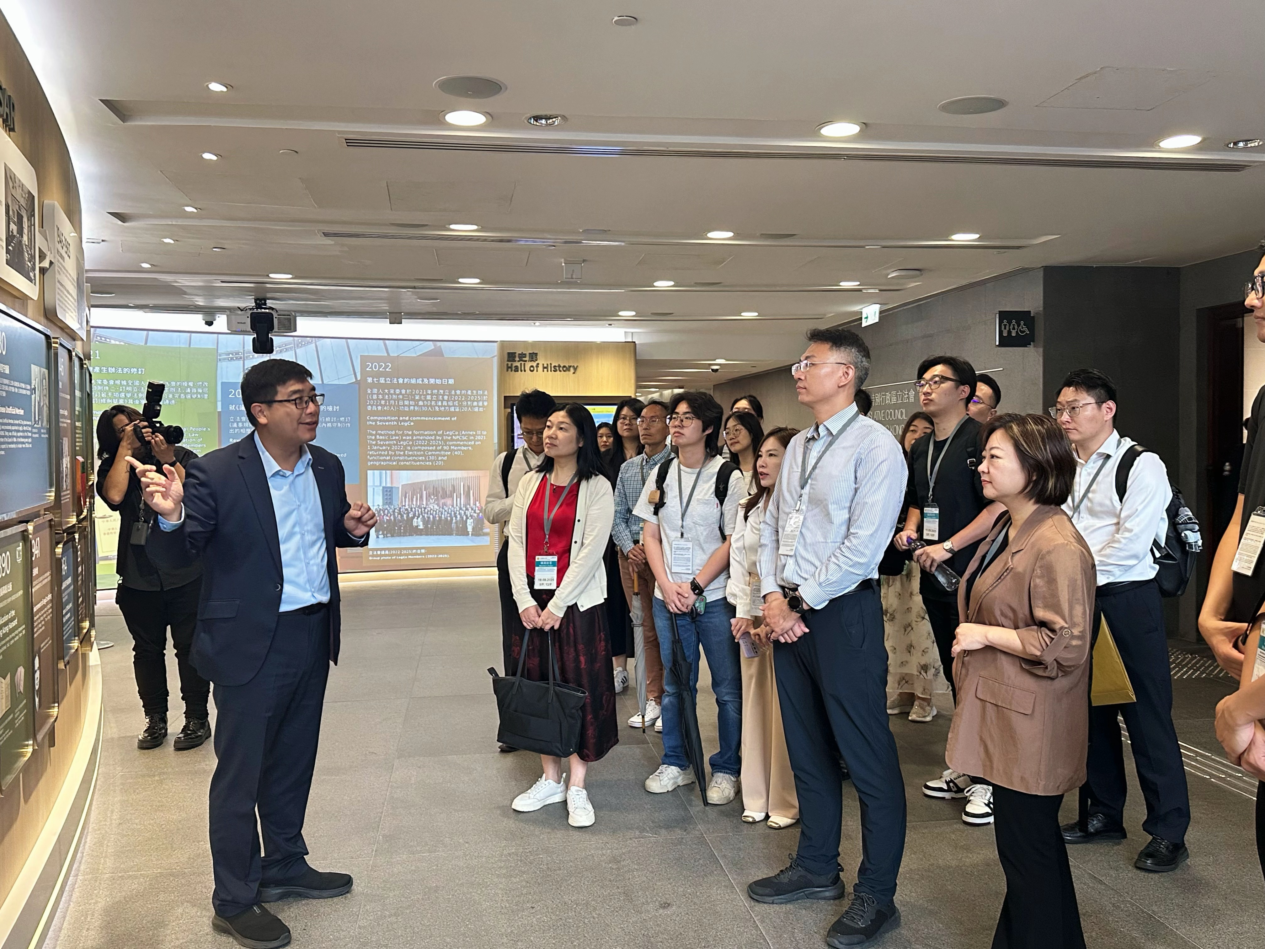 李浩然院长亲自担任讲解员,为团队提供了详尽的导览。青年员工们参观了历史廊、会议厅,深入了解立法会的运作机制与社会职能,通过沉浸式参观感受立法过程的严谨性与规范性,深刻认识到立法会作为香港特别行政区重要机构在社会治理中发挥的关键作用。